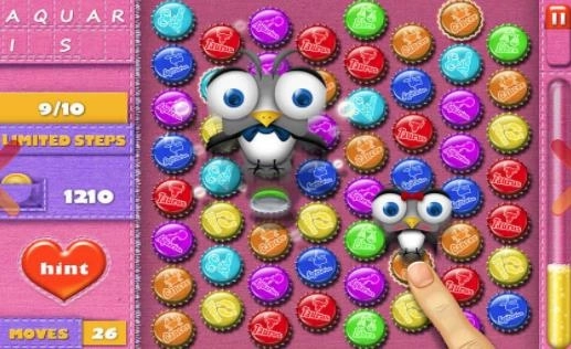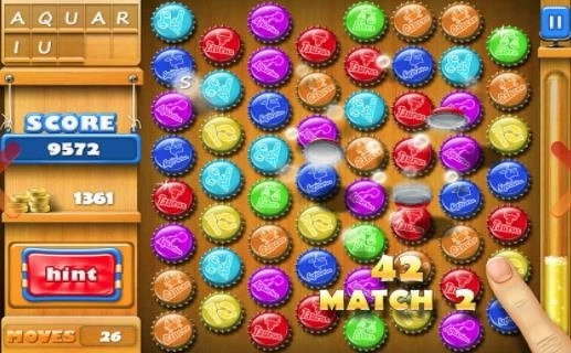 2、各种瓶盖以蜂窝型排列,利用*近的2个瓶盖能互相交换的方法,把3个以上的瓶盖连成一直线就可以消除啦。
