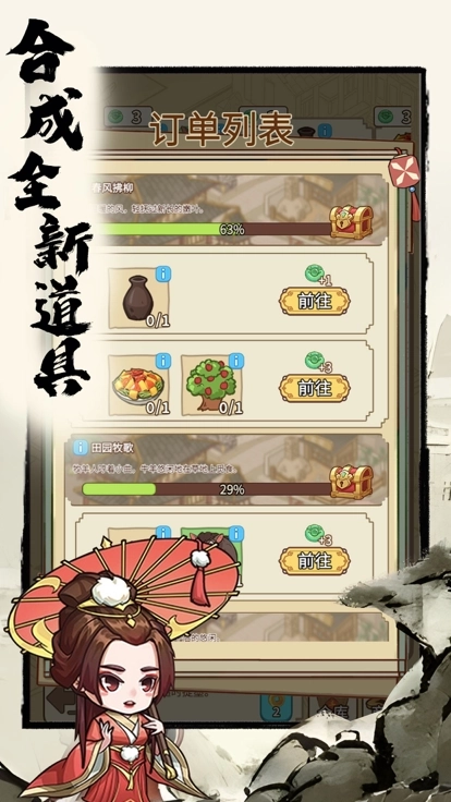 2、大量任务订单,合成新的道具,即可完成其中的目标,达成所有的订单,获得更多收益。