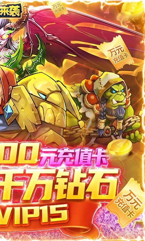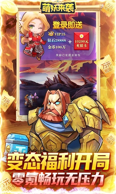 1、上线即送10000元充值卡,VIP15,28888钻石,100万金币。