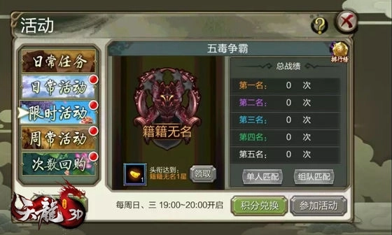 每周三、周日19:00-20:00,角色达到60级的少侠们即可报名参加五毒争霸活动。每场活动共分为5个阵营,每阵营4人全场混战,7分钟内获得更高积分的队伍获胜。五毒争霸为跨服活动,但你也不用担心会遇到牛逼大佬,活动将会根据等级划分为60-100,101-125两个级别分别匹配,卡级的少侠们让我看到你们欢呼的双手!