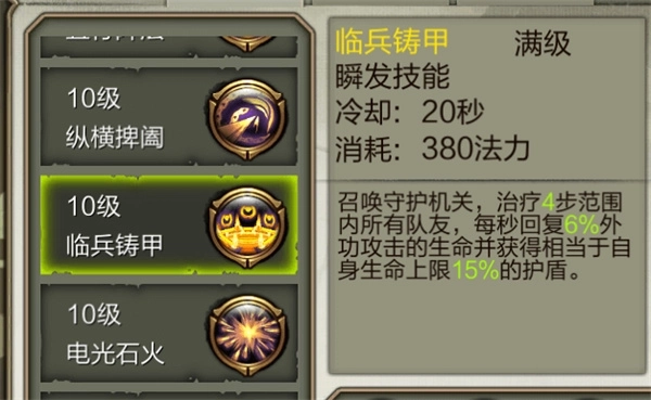 技能原理:提供护盾和治疗;技能本身不算强大,搭配10层天赋才变得完整——提升自身和队友15%暴伤减免或韧性,极大地增加了团队生存能力。