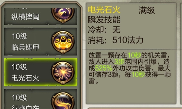 技能原理:电光石火作为一个能够储存3次的陷阱技能,具有单次最高伤害加成,是为天龙3D最高秒伤。如果运用得当能在瞬间爆发出秒天秒地秒宇宙的夸张效果,且对手猝不及防。