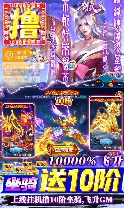 2.上线即得10000000元宝,20000000绑元,10000000铜钱,秒升GM1,开启GM商城,开服无限充值活动天天抽真充!