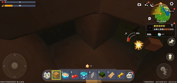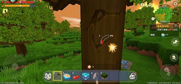 点击快捷栏上的斧子,拿在右手中,靠近一棵树干,手指按住树干上的方块,进度条出现,当进度条100%时树干被成功砍下。