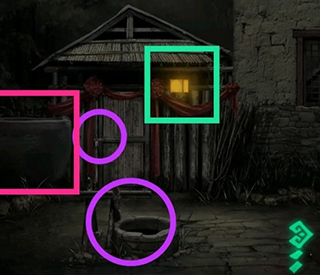密码打开门,得到道具装在水井上。查看灯笼线索。粉色方框缸内有虫子。