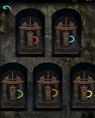 【铁铺】在右边桌子上有铁棍,左边地上放置着火钳,左边桌子上有燧石,墙上有谜题(第一列已经排列好,第二列接着第三列有一个钩子形状的物品,4、5、6位置最下面是铲子,最上面是月亮形状的物品),按照这些线索操作可得到银锭,然后将银锭放在右边桌子的钳锅里并带走。