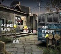 3、用撬棍去售票处把盒子拉出来,获得剪刀,再用剪刀把娃娃剪开获得钥匙,用钥匙去把失物招领打开获得卡片。