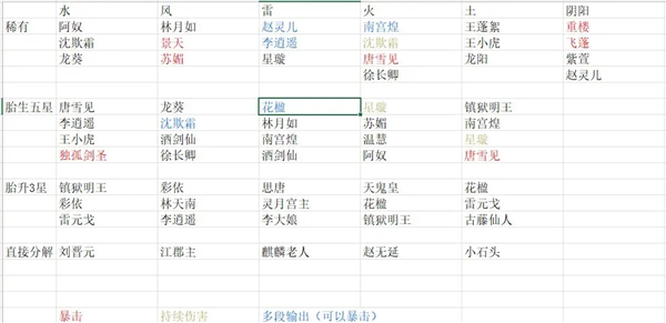 下图是目前侠客统计,其中只标注了输出类的侠客,关于辅助和肉暂时没有标注,以待后文再说