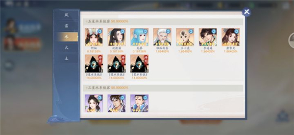 附上一张水系稀有度图片,前三个相对稀有。不过龙葵的技能并非冰冻,虽实力强劲,但与其他侠客配合度欠佳,故而在此未作推荐。后四个获取难度适中,而三个紫色角色中仅雷元戈值得培养。大家可依据自己抽到的卡牌,合理调配阵容,无需强求,星级也是战力的一部分。