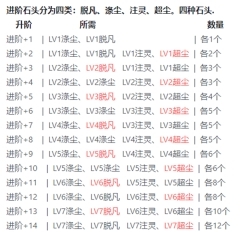 进阶石头分为四类:脱凡、涤尘、注灵、超尘。四种石头、