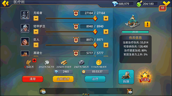 玩家只需耗费相较于训练新兵较少的资源,就能在医疗所治疗部队。医疗所最高能升级到25级,提升其等级或者多建造几所医疗所,都可以增加伤病容纳量。