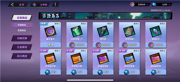 上面提到了的资源商店只是黑市商店的一部分,其实黑市商店共分为4大块,日常商店、分解兑换、公会商坊以及战斗商店,其中战斗商店是后面玩法解锁之后对应的兑换商店,公会商店需加入公会才有,下面公会介绍会提到。