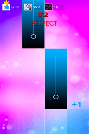 1、游戏的操作依然采用了全屏触控的模式,玩家们通过手指点击屏幕中的黑键即可完成音符的匹配,当然要想完成整个歌曲的挑战,那就得一个不差的点击完所有黑键了。