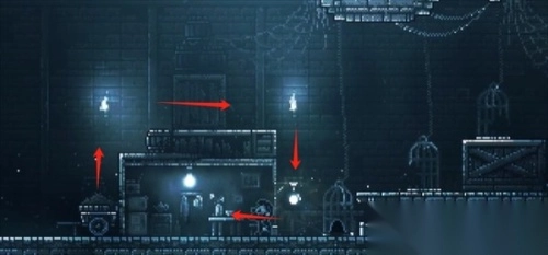 7.流浪者视角。按下黑色怪物左边的按钮,3个铁笼升上去,爬上铁笼往右走,然后爬最右边的梯子上去。