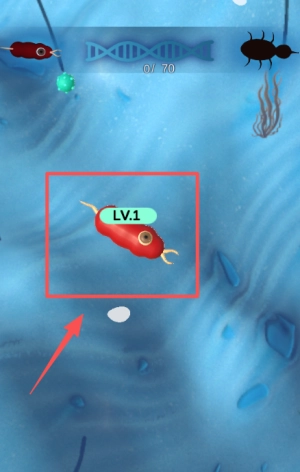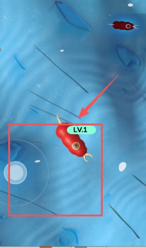 3、看水域场景,点左下角半透明操控区,或观察蓝色背景上LV.1红虫子,进行生物互动操作。