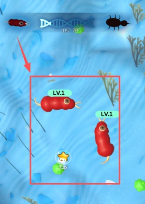 4、看海洋场景,点红框内两只LV.1红虫或绿色无敌角色,或看上方15/70DNA,继续进化挑战。