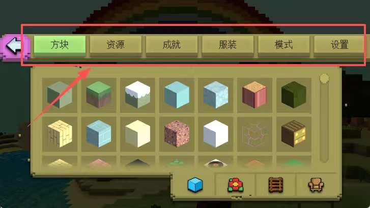 4、游戏界面顶部有方块、资源等标签栏,主体展示各种颜色方块,左下角紫色箭头图标,底部有小图标,直接点这些标签和图标。