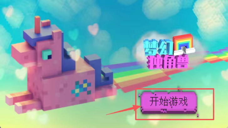 1、粉独角兽喷彩虹,蓝绿渐变背景有心形光斑,右上角紫色开始游戏按钮被红框标出,直接点这个按钮就能进入梦幻独角兽游戏。