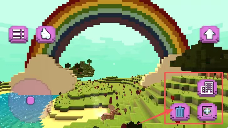 2、像素风游戏画面有彩虹草地和鹿形生物,右侧四个功能按钮分别是上箭头、建筑、垃圾桶、加号,左侧两个按钮是列表和手指图标。