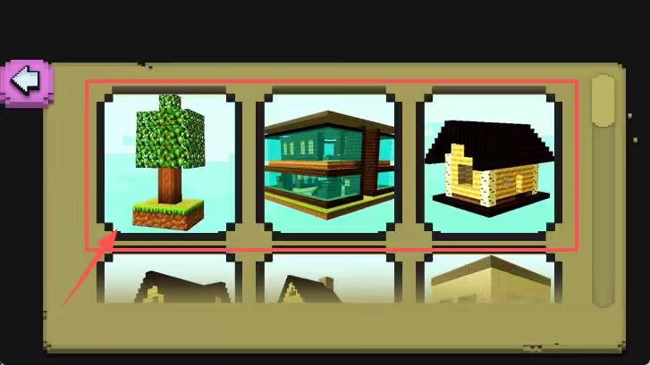 3、黑色背景土黄框里有六个物品格子,上面三个分别展示绿树、蓝色玻璃建筑和木质小屋,左上角紫色返回箭头指向左边。