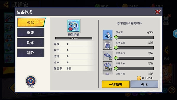 装备强化对武道家属性的提升非常大,所以在游戏中要偏向对装备和金币的资源获取,把低阶的装备给高阶的装备当作强化材料消耗。