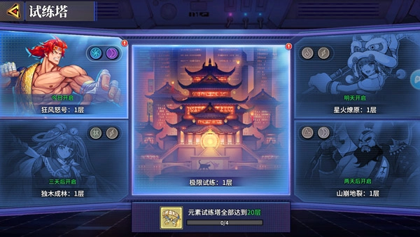 开服第五天解锁元素试炼。每天开启一个元素塔,每天只能挑战10层,挑战成功可以获得当前层数的奖励,有大量的武道家元素碎片!