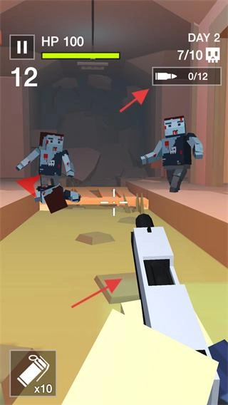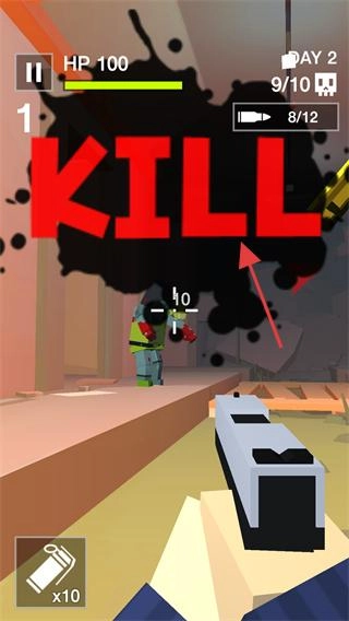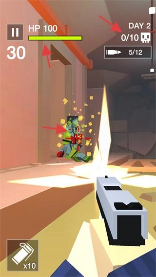 1、操作枪械射击僵尸,通过消灭敌人积累击杀数,在此过程中留意生命值和子弹数量的变化。
