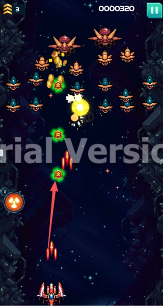 3、击落大的敌机之后,我们还会获得一些可以升级的飞机,注意去拾取。