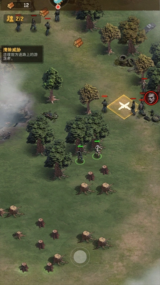 2、完成新手教程后,使用界面下方的按钮控制角色,击败丧尸并完成伐木等任务。