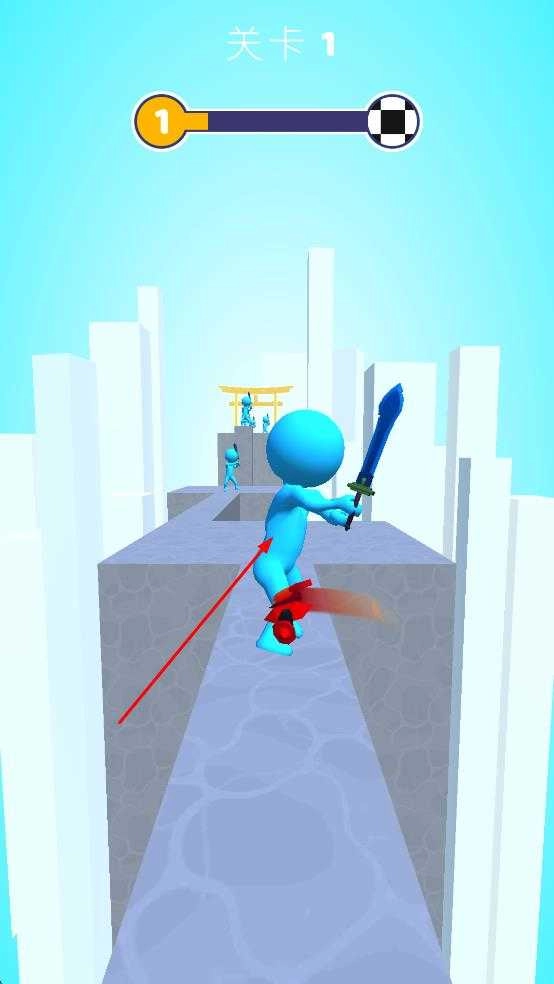 2、角色遇沟壑,看准时机让武器触碰角色脚部,借助推力助角色跳跃过沟,持续向终点前进。