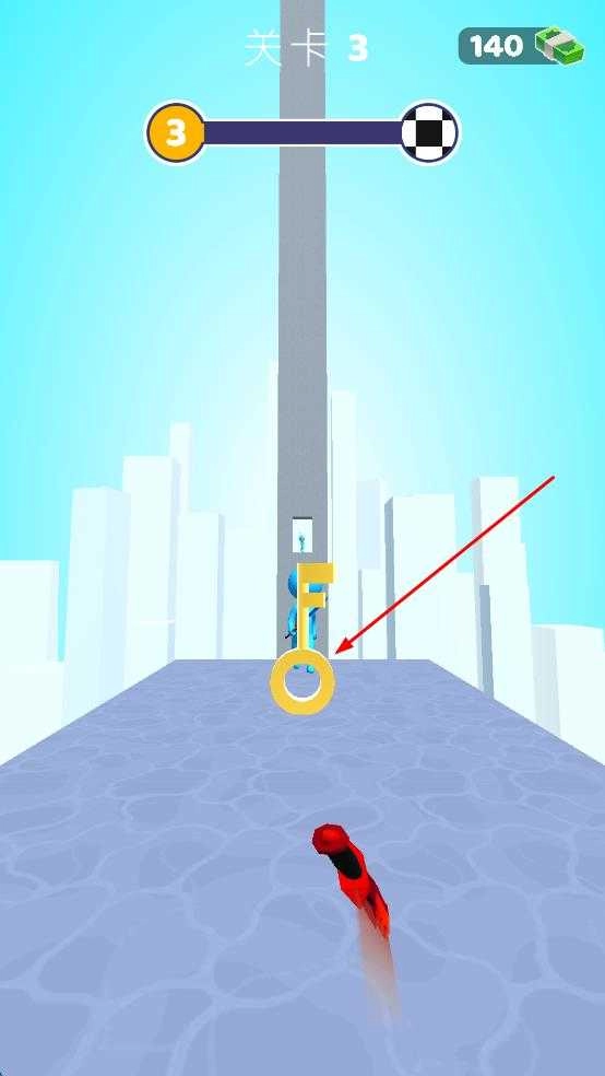 3、关卡3出现巨型钥匙,引导红色武器靠近,使其穿过钥匙圆环,开启通道,快速抵达目标点。