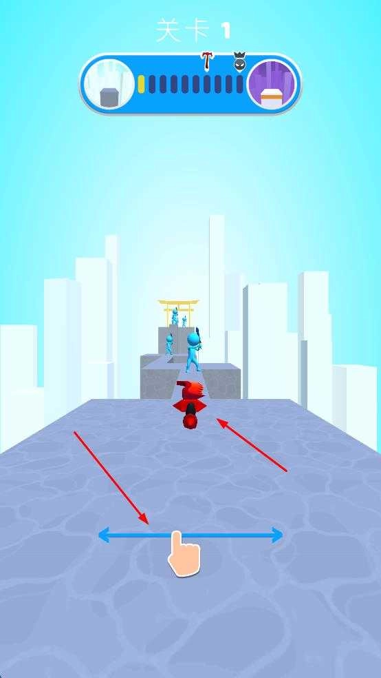 1、点击游戏关卡开局,滑动蓝色双向箭头,控制红色武器左右移动,调整位置,瞄准路径上敌人推进。