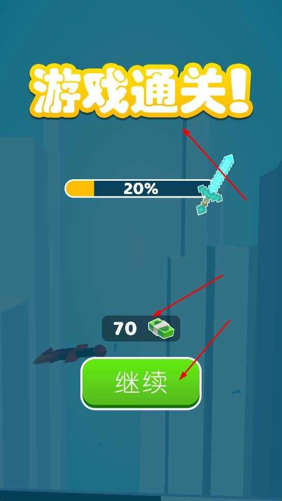 4、游戏通关后,可获70货币奖励,点击继续进入下一关,也可关注武器进度,后续强化提升战力。