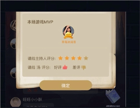 6、每局游戏结束并完成推理环节后,主持人将评选出本场的MVP玩家,获选玩家可获得对应的奖励,同时也能对主持人进行评分。