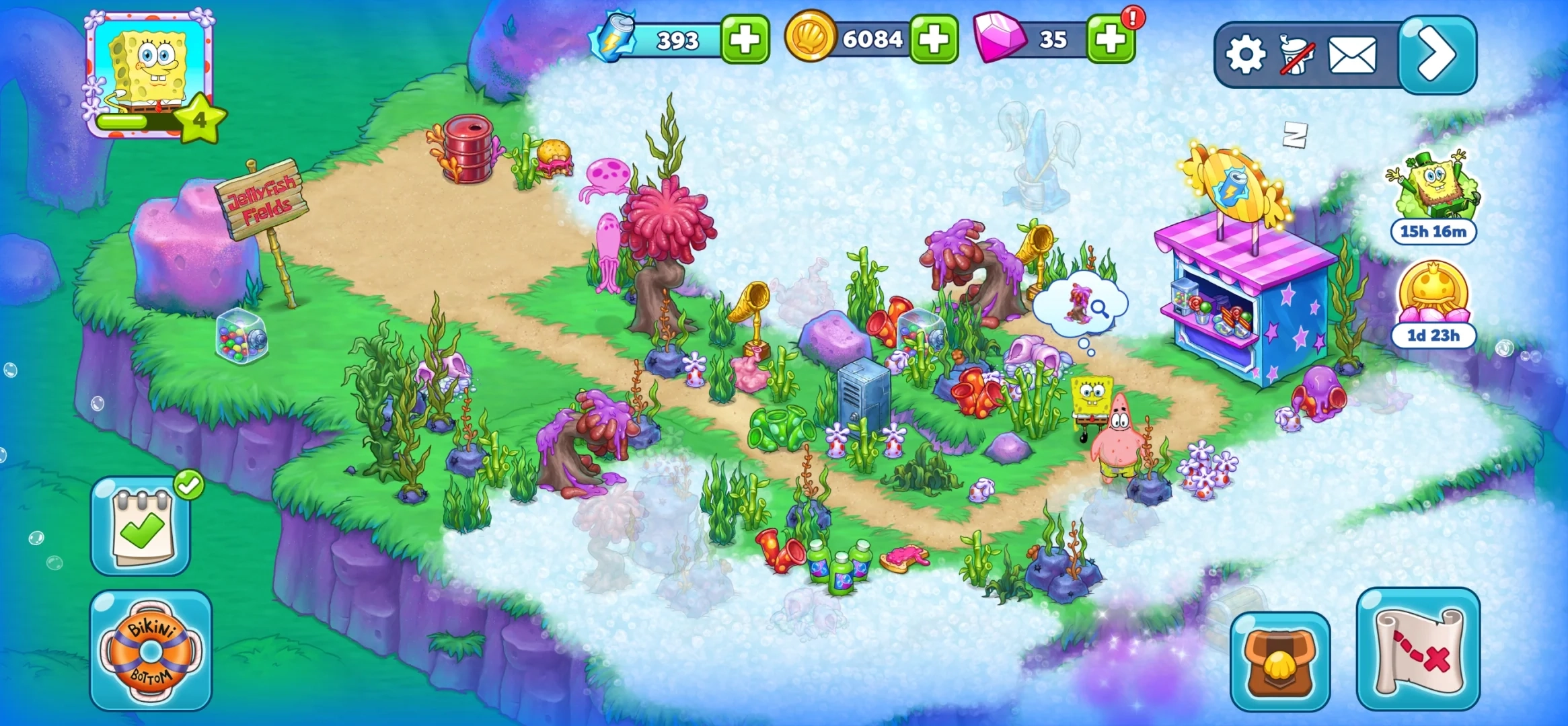 1.与海绵宝宝、派大星一同遵循任务指引,一步步清理比奇堡的果酱。