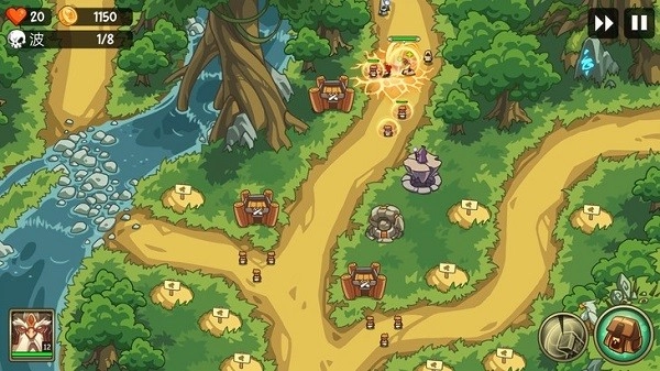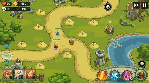 在进入战斗时我们三位英雄边上的土包就是我们需要建造防御塔的地方了,只需要点击土包然后选择防御塔的类型点击对号就可以创建成功,如果金币足够多的话是可以升级你的防御塔的等级越高攻击伤害越大。如果金币不多的话那么优先升级在路口前端最先和敌人战斗的防御塔。