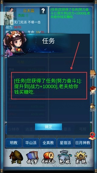 1、要完成【努力奋斗1】这个任务,需要把战力提升到【10000】,大家可以借助学习武学、配备武器的方式来快速实现这一目标,进而领取任务奖励。