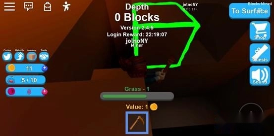 首先我们要去矿场,然后点击屏幕正下方的木镐将其装备上,然后点击要挖的矿,这时候矿就会出现绿色的框框,按住它就能开始挖啦!选择目标后我们就能看见目前的矿值多少钱,最开始我们只能挖价值1金币的矿,一次只能装满10个矿,价值10金币。