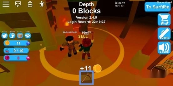 当背包装满后,我们直接点击右上角的传送就能直接回到地面了。这时候去找标有出售的铁匠,进入黄色的圈圈就能自动将背包里的矿石换成金币,然后就可以继续去快乐挖矿了!