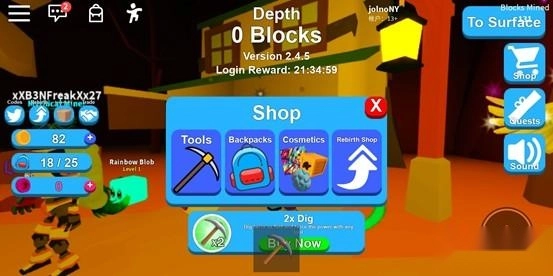 当拥有一定数量的金币后,我们可以去找标有购买标识的商人购物!进入黄色圈圈后,会弹出商店界面,共有四个分类,分别是工具、背包、装扮(可以购买一些发型、宠物等)和重生商店(可以购买一些道具)。前期主要是购买更高级的工具和背包,这样就不用频繁回到地面,提高挖矿(赚钱)的效率~拥有高级的道具后,我们就能逐渐深入更下层的地里挖矿,能挖到更好的东西,运气好的话能挖到金箱子、钻石等,但对应的,需要的挖矿工具级别会很高!