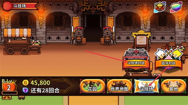 1、进入【斗技场】界面后,可选择【斗技场对战】或【蓝牙对战】,当前【B.Lv-2】拥有【45800】金币,还剩【28回合】可参与对战。