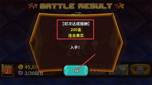 4、完成对战后将获得【初次达成报酬】,包含【200金】与【连击果实】,点击界面中的【OK】按钮即可领取奖励。