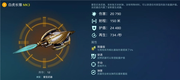 另一款重型近战武器[长锥]/[白虎长锥],其直接伤害能力与[破碎]相当,且具备穿透所有能量护盾的能力。然而,该武器的有效射程仅为150米,相比之下,[破碎]的最远射程可达600米,并且其减速效果在留敌方面表现更加出色。