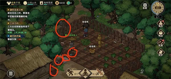 遇到老头吹牛,听他说完,进入战斗输了也没事,之后选同意拜师、天下第一、多人一起闯江湖,进门触发乞丐剧情,如果刚才没拿二百块钱就不会触发了,选不和他计较加五仁德。之后去地图左上方找他单挑,修罗模式最好存个档,再点一手火武道,火武道的两条分支我们选排山倒海那边一直点就行,这臭小子有时候会撒石灰,可能打不过,击败后让他还钱,再去地图左上方找采石匠对话学采矿,去和水井旁边的小宝对话学会捉虫,再往下走找到渔夫学习钓鱼,最后去和摆地摊的郎中对话,选择医道,之后点开背包穿戴牡丹花,去水井上方房子内给风韵犹存花四娘送礼,不睡觉,送胭脂送到四十五以上好感,出来找铁匠学习锻造,再交谈接任务让我们找五个铁矿石,来到石匠右边存档挖矿石,懒得sl也可以直接找石匠买,交完任务得到防具直接穿上,之后去下面sl钓鱼,别让鱼竿坏了,钓完鱼在右边木头处捉虫子,捉完虫子去上方喂一只叫司晨的鸡