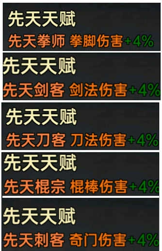 主角的职业发展方向可由先天天赋而定,该游戏一共有20种先天天赋。先天天赋是随机抽取一条,随机次数不限,可供玩家自主选择。玩拳选先天拳师,玩刀选先天刀客,玩剑选先天剑客,玩棍选先天棍宗,玩奇门选先天刺客,天赋伤害+4%。