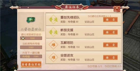 爵位任务每天给的经验非常之少,但是因为和战功有关,也是必做任务。该任务每天能完成5次,优先完成难度高的,但是其中会有击杀敌对阵营玩家任务需要谨慎,因为完成30-40级的任务地图在论剑山庄,40级-50级在刀锋镇,有时候这图敌对活跃玩家较少就无法完成该任务。一般来说晚上0点和中午都有大量玩家在完成任务。