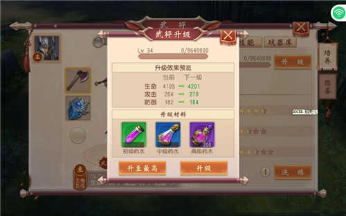 使用武将经验药水可以提升武将等级,升级后会增加武将属性,但是武将等级不能超过主角等级。