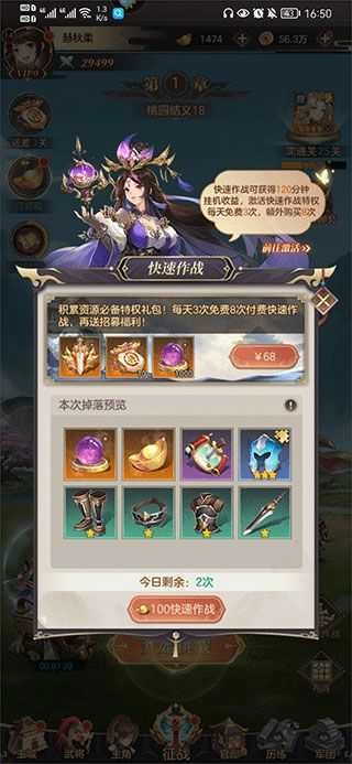5、快速作战可以获得120分钟挂机收益,每天免费一次领取,使用元宝可以额外再作战3次。如果激活快速作战特权,每天可以免费3次,使用元宝可以额外再作战8次。小编建议非RMB玩家还是不要买这个快速作战特权,每天坚持挂机就可以了。