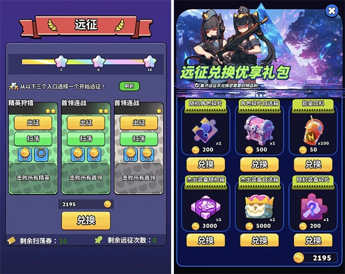 1、挑战远征可获得装备、远征金币、装备强化图纸,同时远征金币可以兑换角色碎片、杰出装备等材料。