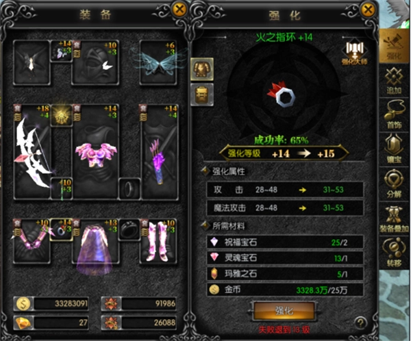 首饰的强化追加和武器防具相同,拥有同一套判定机制。需要注意的是,首饰类型的不同将会造成强化属性的不同,耳环为防御类型,强化得到防御加成;项链、指环为攻击类型,强化得到攻击加成。